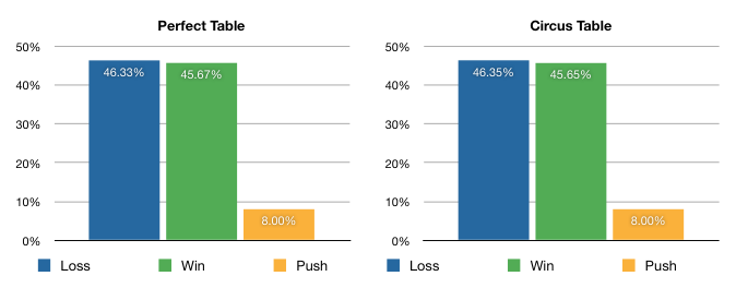 You should notice at this time that the percentages are, basically, the same. At the perfect table, the player using basic strategy lost 46.33% of the time, won 45.67% of the time, and pushed 8% of the time. At the circus table, on the other hand, the player using basic strategy lost… 46.35% of the time, won 45.65% of the time, and pushed 8% of the time. That’s an extra .02% hands lost, or 2,000 hands in 10,000,000. In case you’re having difficulty visualizing the difference between those percentages, here are the two graphs merged: